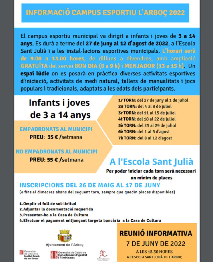 L'Ajuntament de l'Arboç organitza novament per aquest estiu el Campus Esportiu Municipal. Un espai lúdic on es posaran en pràctica diverses activitats esportives d'iniciació, activitats de medi natural, tallers de treballs manuals, jocs populars i tradicionals, adaptats a les edats dels participants, nens i nenes de 3 a 14 anys.
