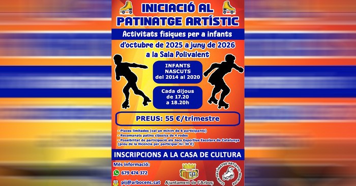 L'Ajuntament de l'Arboç, en col·laboració amb el Club Patinatge Artístic Monjos, obre el període d'inscripcions per al nou curs d'Iniciació al Patinatge Artístic, una activitat física destinada a infants nascuts entre els anys 2014 i 2020. El curs, que començarà el pròxim mes d'octubre i s'allargarà fins a juny de 2026, tindrà lloc a la Sala Polivalent cada dijous en horari de 17.20 a 18.20 hores.