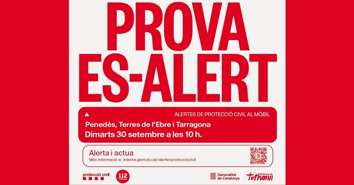 Demà, dimarts 30 de setembre, a partir de les 10:00 del matí, es durà a terme una prova del sistema d'alertes als telèfons mòbils (ES-ALERT) a les vegueries del Penedès, Tarragona i Terres de l'Ebre, incloent-hi les comarques de l'Alt Penedès, Baix Penedès, Garraf i part de l'Anoia.