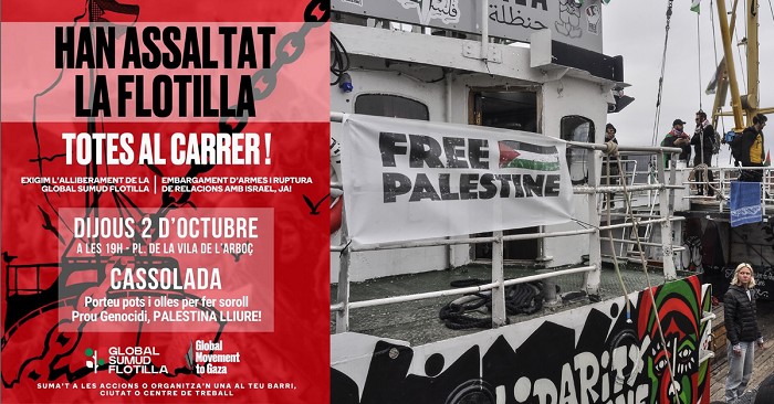 L'Ateneu Arbocenc ha convocat una cassolada per avui dijous 2 d'octubre, a les 7 de la tarda, a la plaça de la Vila de l'Arboç, en resposta a l'assalt sofert per la Global Sumud Flotilla. Aquesta acció forma part d'una campanya internacional de suport al moviment Global Movement to Gaza.