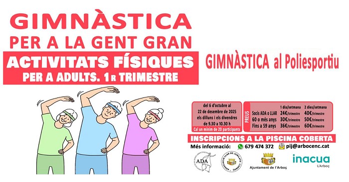 L'Ajuntament de l'Arboç posa en marxa una nova edició de l'activitat de gimnàstica per a adults i gent gran, que tindrà lloc des del pròxim dilluns 6 d'octubre i fins al 22 de desembre, al Poliesportiu Municipal. Les sessions es realitzaran els dilluns i els divendres de 9.30 a 10.30 h i tenen com a objectiu fomentar un estil de vida actiu, millorar la mobilitat i contribuir a un envelliment saludable, i que compta amb la col·laboració de l'Associació de Dones Arbocenques (ADA), la Llar de Jubilats de l'Arboç, i la implementació per part de Inacua l'Arboç.
