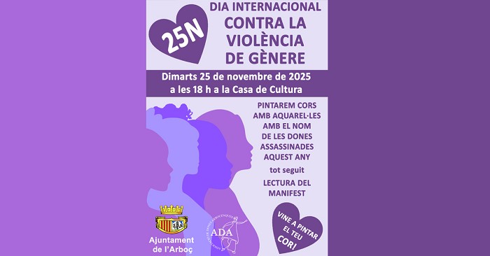 L'Ajuntament de l'Arboç, amb la col·laboració de l'ADA, l'Associació de Dones Arbocenques, se sumarà el pròxim dimarts 25 de novembre a la commemoració del Dia Internacional per a l'Eliminació de la Violència contra les Dones 2025, una jornada que cada any denuncia les violències masclistes i reivindica els drets i la seguretat de totes les dones arreu del món.