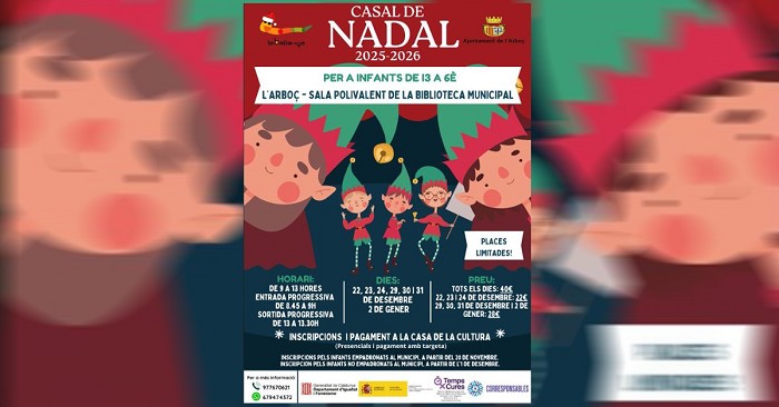 L'Ajuntament de l'Arboç, amb l'organització de La Ballaruga i el suport del Pla Corresponsables, Temps per Cures, la Generalitat de Catalunya i el Ministeri d'Igualtat, impulsa una nova edició del Casal de Nadal 2025-2026, una proposta de lleure pedagògic adreçada als infants d'I3 a 6è de primària.