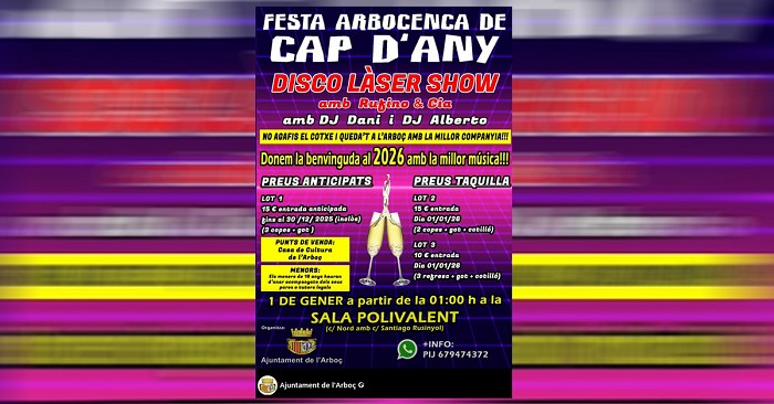 L'Arboç es prepara per acomiadar l'any 2025 i donar la benvinguda al 2026 amb una gran festa de Cap d'Any que promet música, espectacle i diversió fins a la matinada. L'esdeveniment tindrà lloc l'1 de gener, a partir de les 01.00 h, a la Sala Polivalent de l'Arboç, amb un espectacular Disco Làser Show com a principal reclam.