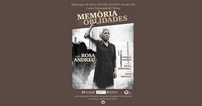 El diumenge 1 de febrer, a les 18.30 h, el Teatre del Centre Parroquial de l'Arboç acollirà la representació de "Memòria de les Oblidades", una proposta teatral de fort contingut històric i emocional interpretada per la periodista i actriu professional arbocenca Rosa Andreu.