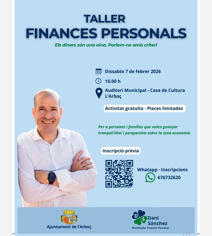 El taller tindrà lloc el dissabte 7 de febrer a les 10.00 h, a l'Auditori Municipal – Casa de Cultura de l'Arboç. Es tracta d'una activitat gratuïta amb places limitades, concebuda com una xerrada pràctica que convida a parlar de diners amb criteri i a entendre'ls com una eina al servei de les persones.