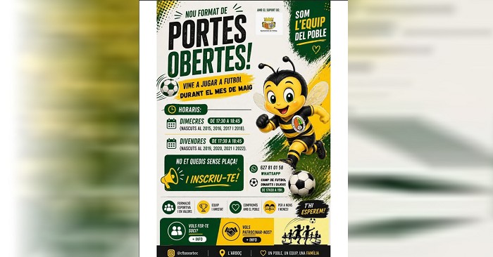 El Club de Futbol Base Arboç ha posat en marxa una iniciativa pionera al municipi: un nou format de Portes Obertes que permetrà a tots els nens i nenes del poble provar el futbol de manera totalment gratuïta durant el mes de maig de 2025. Sota el lema "Som l'equip del poble", el club vol reforçar el seu vincle amb la comunitat i facilitar l'accés a l'esport en edat de formació.